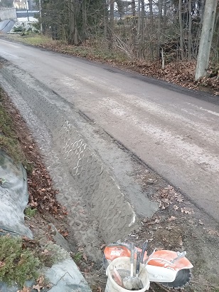 polegajace na umocnienie pobocza azurami. Prace wykonywane przy uzyciu najmniejsze z naszych koparek Bobcat e16 oraz wywrotek.